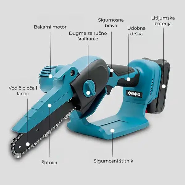 - Efikasnost: Snažan motor omogućava brzo i precizno sečenje drveta i grana.