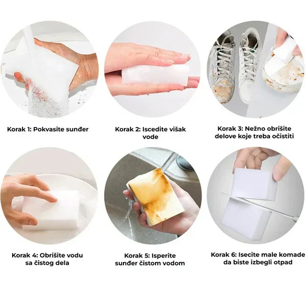 Očisti patike bez naglog pritiskanja i ribanja sa melaminskim sundjerima jer ih čisti bez hemikalija i bez drugih proizvoda za čišćenje. Više nigde nećeš kasniti jer iako uzmeš patike u zadnji čas da ih čistiš pre nego što kreneš to neće biti problem jer ovaj sundjer lako razgradjuje fleke i zatim ih upija.