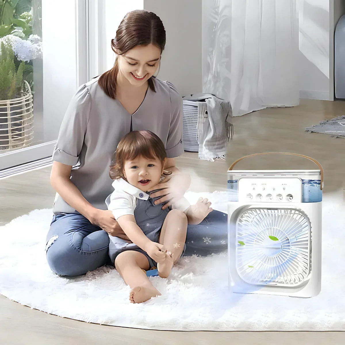 Predstavljamo vam našu Mini klimu – savršeno rešenje za tople dane. Ovaj kompaktni uređaj kombinuje više funkcija: radi kao ventilator, difuzer, ovlaživač vazduha, ispušta osvežavajuću vodenu maglu, a služi i kao noćna lampa. Dizajniran je da vam pruži zasluženo osveženje gde god da se nalazite.