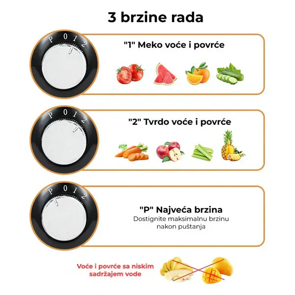 - Jednostavan za upotrebu: Dve brzine omogućavaju prilagođavanje različitim vrstama voća i povrća.