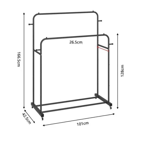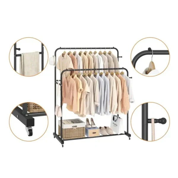 Ovaj stalak nudi dve paralelne šine za vešanje odeće, čime dobijate duplo više prostora u poređenju sa klasičnim jednorednim stalcima. Na jednom mestu možete odložiti jakne, kapute, haljine, dok donja šina čeka vašu obuću, torbe, ili omiljene aksesoare.