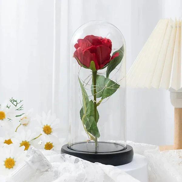 Elegantno stakleno postolje obasjano je nežnim svetlom koje naglašava lepotu ruže i pruža sofisticiran izgled.