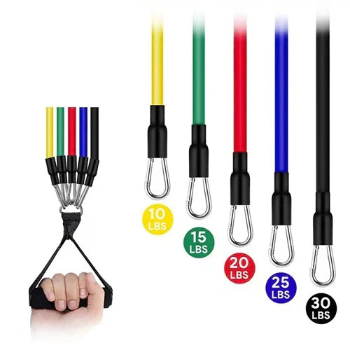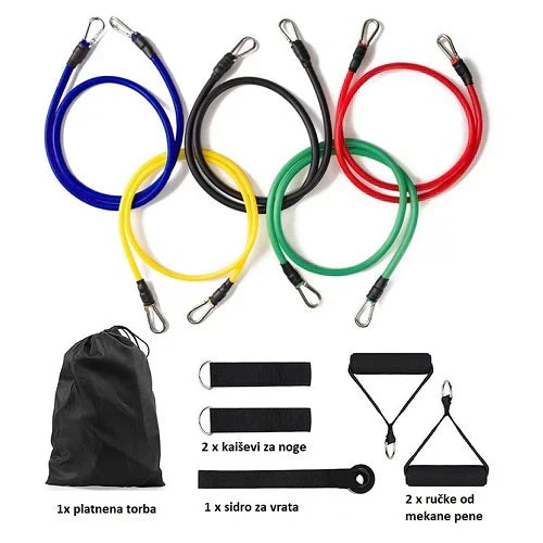 Trake za rastezanje i vežbanje - Home GYM set uključuje 5 traka različitog otpora, 2 ručke, 2 kaiša za gležnjeve i sidro za vrata. Idealne su za kvalitetan trening kod kuće, pružajući fleksibilnost i prilagodljivost za sve nivoe kondicije.